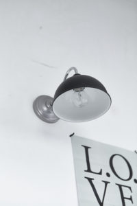 Oświetlenie industrialne, lampy LOFT, kinkiety oraz plakaty mapy.