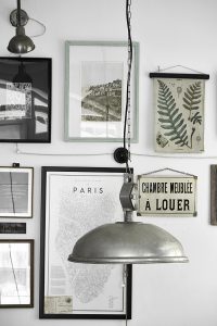 Oświetlenie industrialne, lampy LOFT, kinkiety oraz plakaty mapy.