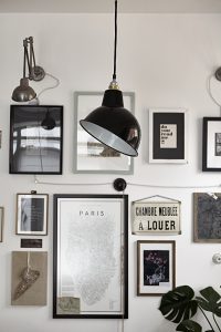Oświetlenie industrialne, lampy LOFT, kinkiety oraz plakaty mapy.