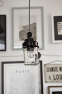 Oświetlenie industrialne, lampy LOFT, kinkiety oraz plakaty mapy.