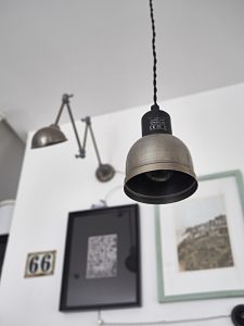 Oświetlenie industrialne, lampy LOFT, kinkiety oraz plakaty mapy.