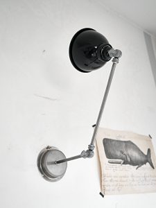 Oświetlenie industrialne, lampy LOFT, kinkiety oraz plakaty mapy.