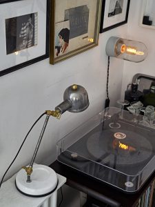 Oświetlenie industrialne, lampy LOFT, kinkiety oraz plakaty mapy.