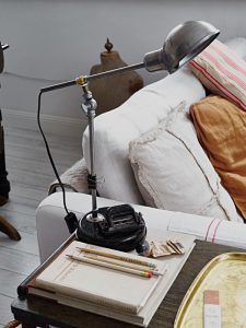 Oświetlenie industrialne, lampy LOFT, kinkiety oraz plakaty mapy.