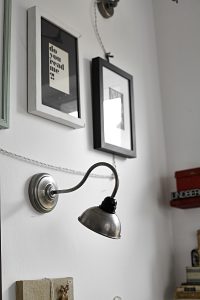 Oświetlenie industrialne, lampy LOFT, kinkiety oraz plakaty mapy.