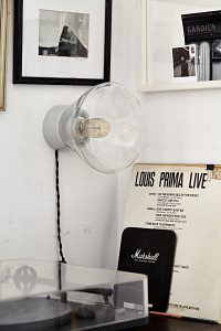 Oświetlenie industrialne, lampy LOFT, kinkiety oraz plakaty mapy.