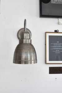 Oświetlenie industrialne, lampy LOFT, kinkiety oraz plakaty mapy.