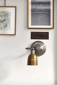 Oświetlenie industrialne, lampy LOFT, kinkiety oraz plakaty mapy.