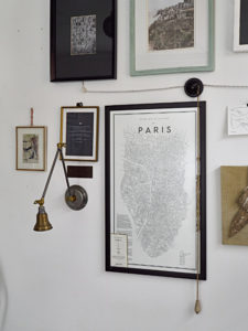 Oświetlenie industrialne, lampy LOFT, kinkiety oraz plakaty mapy.