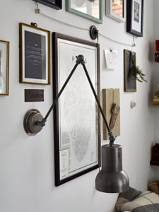 Oświetlenie industrialne, lampy LOFT, kinkiety oraz plakaty mapy.