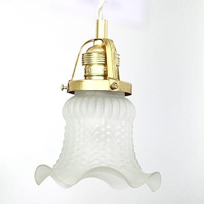 Oryginalny pękaty klosz o kwiatowej formie w połączeniu z skręcanym kablem w bawełnianej otulinie w kolorze białym. Klosz antyczny – bez ubytków. Oprawka na żarówkę mosiężna z ceramiczną końcówką, zawieszona na mosiężnym koszyczku. Do takiej lampę można wkręcić żarówkę o mocy nawet 100W. Długość kabla można regulować. Polecam, także do restauracji lub bistro.