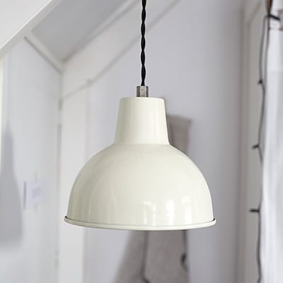 Klosz stalowy malowany – wewnątrz, także kremowy. Dzięki temu daje przyjemne światło. Oprawka na żarówkę ebonitowa na duży gwint e27. Lampa na kablu skręcanym w retro otulinie w kolorze czarnym. Żarówka nie jest w cenie.