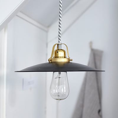 Wszystkie elementy metalowe. Klosz z recyklingu może posiadać małe przebarwienia, rysy, itp. Oprawka na żarówkę z dużym gwintem E27 z porcelanową końcówką. Oprawka mocowana na mosiężnym koszyczku. Do takiej oprawki można wkręcić mocniejszą żarówkę – nawet do 150W. Lampa na kablu skręcanym w otulinie z tkaniny w kolorze białym. Żarówka nie jest w cenie.