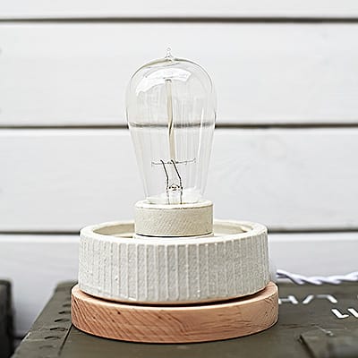 Wszystkie elementy metalowe z recyklingu. Stal surowa – może posiadać ślady rdzy i otarcia. Oprawka na żarówkę jest również metalowa, co dzisiaj jest już rzadko spotykane. Do takiej oprawki można wkręcić mocniejszą żarówkę – nawet do 100W. Żarówka nie jest w cenie.