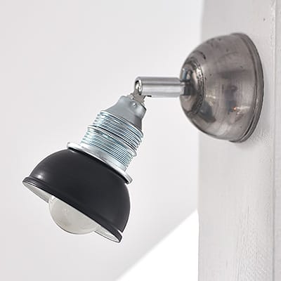 Klasyka stylu industrialnego. Wszystkie elementy metalowe. Stal surowa – może posiadać ślady rdzy i otarcia. Klosz na przegubie – regulacja góra – dół i obrót. Oprawka na żarówkę jest również metalowa, co dzisiaj jest już rzadko spotykane. Oprawka schowana w kloszu. Do takiego kinkietu można wkręcić mocniejszą żarówkę – nawet do 75W. Żarówka nie jest w cenie.