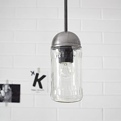 Zastosowane elementy metalowe pochodzą z recyklingu. Mogą posiadać rysy, otarcia i ślady rdzy – stal surowa. Klosz z grubego szkła – wariacja na temat żarówki w słoiku. Oprawka na żarówkę ebonitowa. Nawiązuje do antycznych opraw. Do takiej oprawki można wkręcić żarówkę – do 60W. Oprawka na żarówkę z dużym gwintem E27. Lampa długa na grubym przemysłowym przewodzie. Długość przewodu można regulować np. poprzez zawiązanie węzła. Żarówka nie jest w cenie.