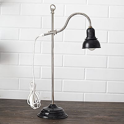 Lampa stabilna. Regulowana wysokość, nachylenie klosza poprzez śruby. Kabel z włącznikiem i wtyczką do kontaktu. Klosz wewnątrz biały – daje przyjemne światło. Oprawa na żarówkę schowana w kloszu. Wykonana z ebonitu na duży gwint e27. Pasująca do charakteru lampy. Żarówka nie jest w cenie.