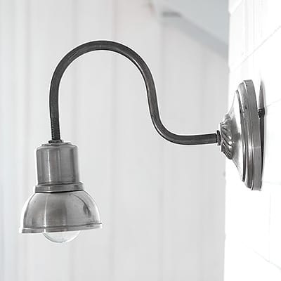 Klasyka stylu współczesnego – mały klosz i duża żarówka. Kinkiet na dwóch przegubach. Można go zawiesić w dół lub w górę, może też świecić prosto. Wszystkie elementy metalowe – pozyskiwane ze starych lamp przemysłowych. Stal surowa – może posiadać ślady rdzy i otarcia. Oprawka na żarówkę jest również metalowa, co dzisiaj jest już rzadko spotykane. Do takiej oprawki można wkręcić mocniejszą żarówkę – nawet do 100W. Żarówka nie jest w cenie.
