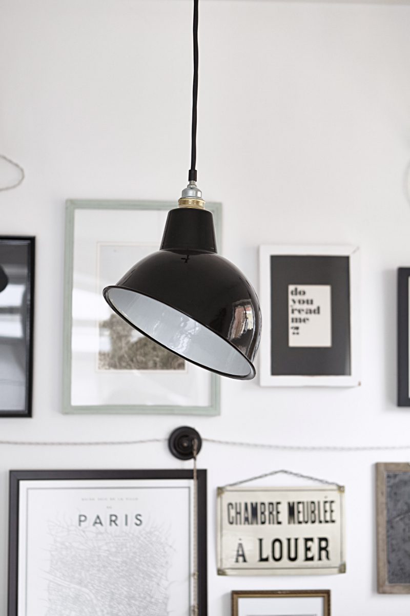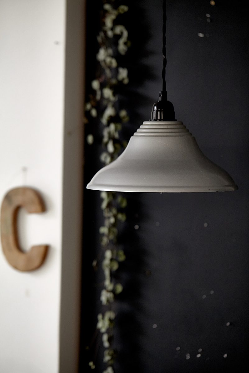 Klosz z recyklingu, ale w bardzo dobrym stanie. Oprawka na żarówkę ebonitowa. Do takiej lampę można wkręcić żarówkę o mocy do 60W. Lampa na kablu przemysłowym. Polecam do kuchni, restauracji, bistro oraz biura. W komplecie czarna podsufitka z materiału termoplastycznego. Żarówka nie jest w cenie.