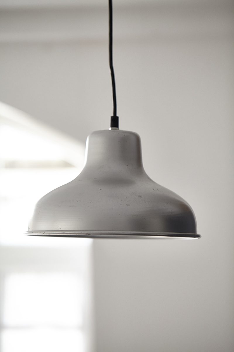 Klosz wykonany ze stali, malowany na biało. Recykling – posiada drobne przebarwienia, ale brak odprysków lakieru. Górny część klosza – stal surowa – możliwe przetarcia, ślady rdzy, itp. Oprawka na żarówkę ebonitowa z dużym gwintem E27. W komplecie czarna podsufitka. Lampa na długim kablu. Polecam do restauracji, bistro oraz biura. Żarówka nie jest w cenie. Lampa wzorowana na produktach firmy Nordal.