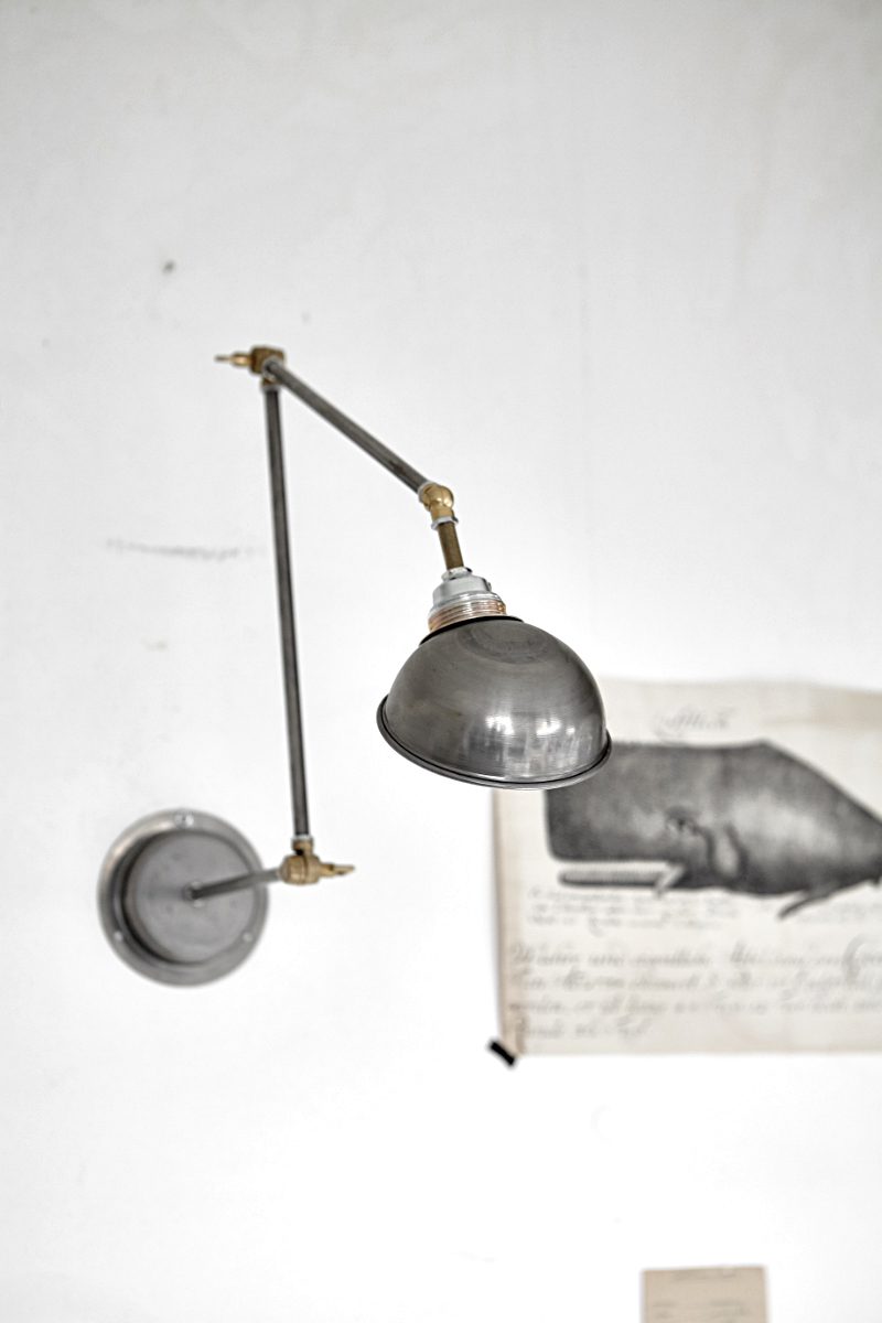 Klasyka stylu industrialnego. Wszystkie elementy metalowe. Stal surowa – może posiadać ślady rdzy i otarcia. Kinkiet na trzech mosiężnych przegubach – regulacja góra i dół (lub lewo – prawo, po przekręceniu ustawienia przegubu na dwóch nakrętkach). Aby zmienić pozycję należy odkręcić motylek – ustawić kinkiet i zakręcić. Będzie trzymał się w każdej pozycji. Oprawka na żarówkę jest również metalowa, co dzisiaj jest już rzadko spotykane. Oprawka schowana w kloszu na duży gwint. Do takiego kinkietu można wkręcić mocniejszą żarówkę – nawet do 150W. Żarówka nie jest w cenie.