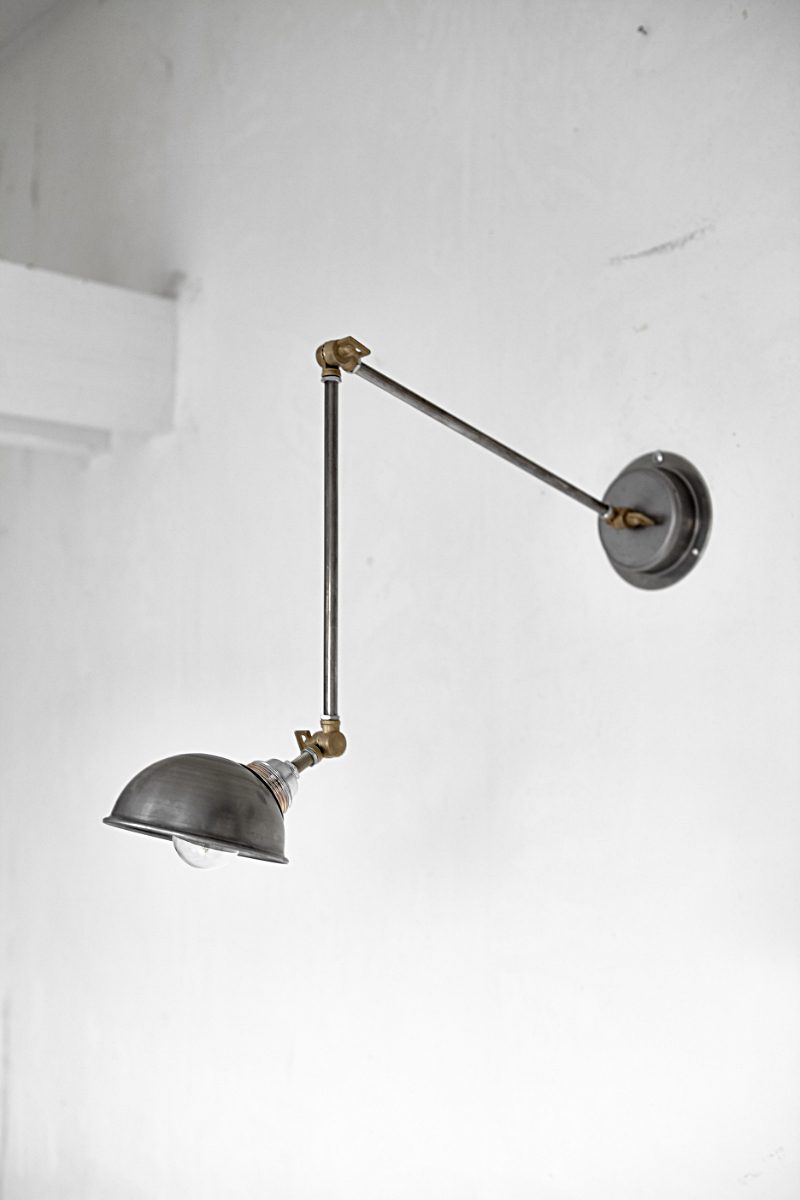 Klasyka stylu industrialnego. Wszystkie elementy metalowe. Stal surowa – może posiadać ślady rdzy i otarcia. Kinkiet na trzech mosiężnych przegubach – regulacja góra i dół (lub lewo – prawo, po przekręceniu ustawienia przegubu na dwóch nakrętkach). Aby zmienić pozycję należy odkręcić motylek – ustawić kinkiet i zakręcić. Oprawka schowana w kloszu na duży gwint. Do takiego kinkietu można wkręcić mocniejszą żarówkę – nawet do 150W. Żarówka nie jest w cenie.