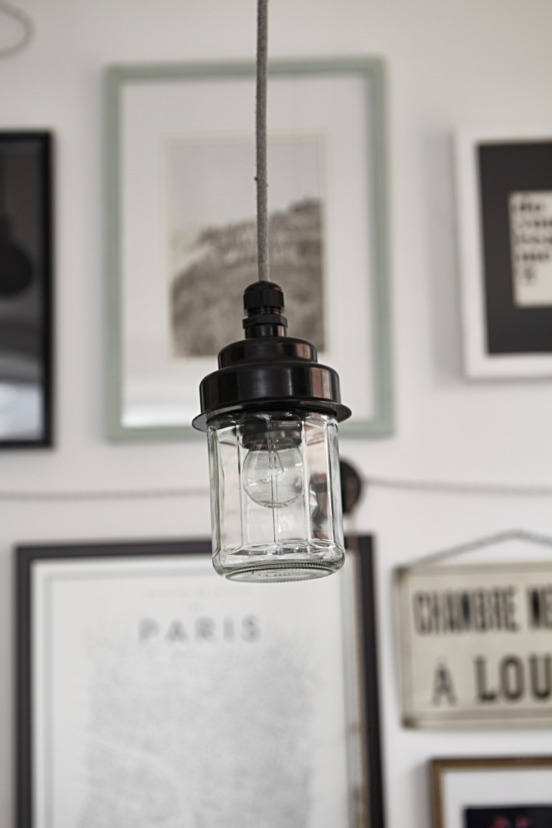 Oprawka ebonitowa, kabel w otulinie z bawełny w kolorze szarym. Lampa może być zawieszona na zadaszonym tarasie lub balkonie – posiada uszczelki. Wspaniała lampa do wnętrz w stylu skandynawskim, loft i francuskim.