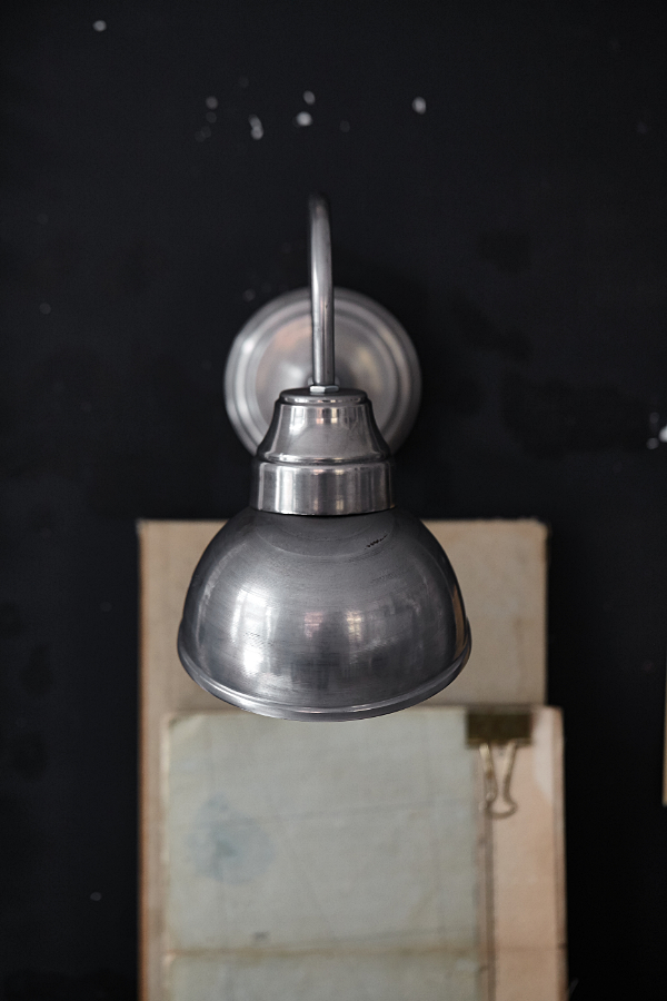Klasyka stylu industrialnego. Wszystkie elementy metalowe. Stal surowa – może posiadać ślady rdzy i otarcia. Oprawka na żarówkę ebonitowa. Oprawka schowana w kloszu. Do takiego kinkietu można wkręcić mocniejszą żarówkę – do 60W. Żarówka nie jest w cenie.