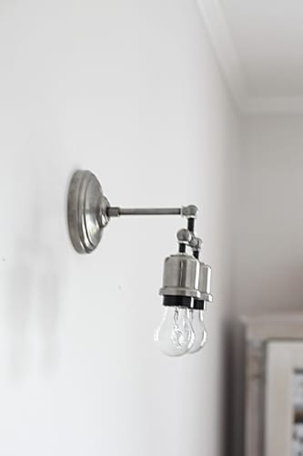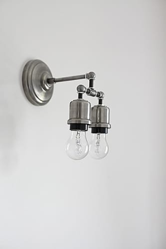 Dwie mocne żarówki mogą dobrze oświetlić ścianę. Wszystkie elementy metalowe. Stal surowa – może posiadać ślady rdzy i otarcia. Oprawki na żarówki ebonitowe. Do takiej oprawki można wkręcić mocniejszą żarówkę – nawet do 75W. Oprawka na żarówkę z dużym gwintem E27. Żarówki nie są w cenie.