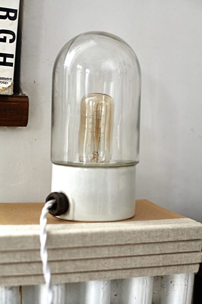 Oprawa porcelanowa w stanie idealnym Klosz szklany z recyklingu – bez pęknieć – stan idealny. Oprawka na żarówkę z porcelany – prosta. Do takiej oprawki można wkręcić żarówkę – do 60W. Oprawka na żarówkę z dużym gwintem E27. Lampa z kablem z włącznikiem i wtyczką do kontaktu. Spokojnie może być kinkietem w miejscu, gdzie jest w pobliżu gniazdko.