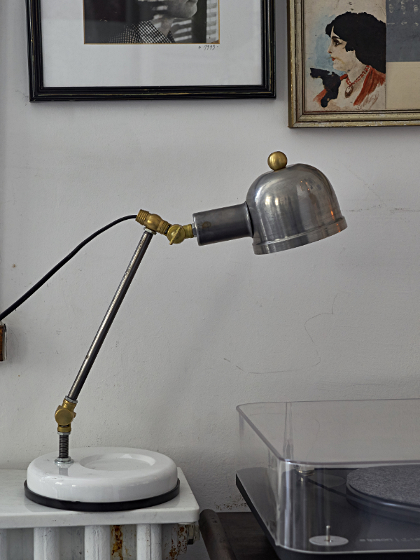 Lampa stabilna – podstawa stalowa. Lampka na dwóch mosiężnych przegubach – pozwala na sporą swobodę w ustawieniu. Elementy ze stali surowej z recyklingu mogą posiadać ślady rdzy, otarcia, rysy. Kabel z włącznikiem i wtyczką do kontaktu. Oprawa na żarówkę na mały gwint e14 – schowana w kloszu. Żarówka nie jest w cenie.