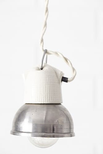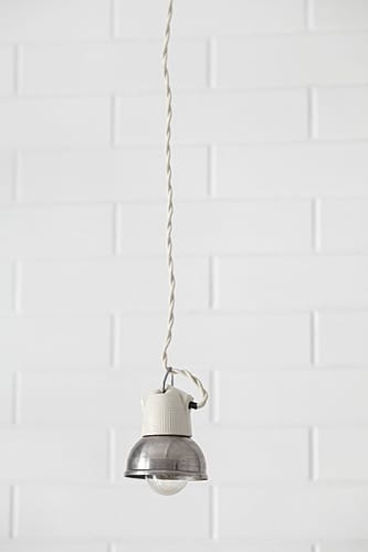 Zastosowane elementy metalowe pochodzą z recyklingu. Mogą posiadać rysy, otarcia i ślady rdzy – stal surowa. Oprawka na żarówkę ceramiczna. Do takiej oprawki można wkręcić żarówkę – do 200W. Oprawka na żarówkę z dużym gwintem E27. Lampa na kablu skręcanym w otulinie w kolorze białym. Długość przewodu można regulować np. poprzez zawiązanie węzła. Żarówka nie jest w cenie.