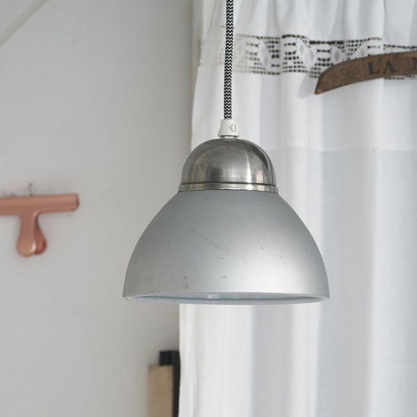 Wisząca lampa industrialna w klasycznym stylu loft. Klosz nawiązuje do wysokich lamp z hal fabrycznych. Pochodzi z recyklingu – posiada przetarcia i rysy. Wewnątrz biały – bez rys.