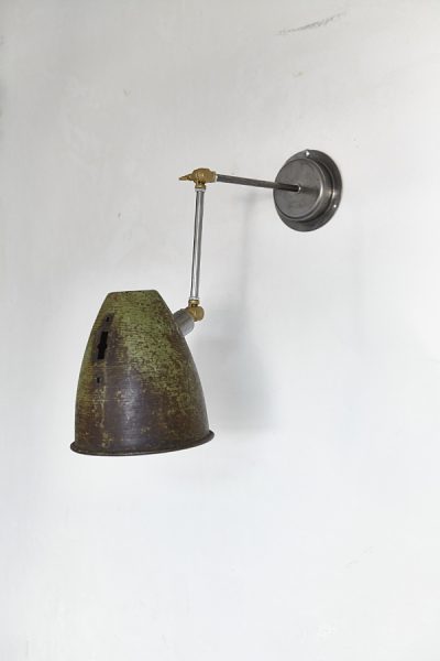 Klasyka stylu industrialnego. Wszystkie elementy metalowe. Stal surowa – może posiadać ślady rdzy i otarcia. Kinkiet na dwóch mocnych, mosiężnych przegubach – regulacja góra i dół (lub lewo – prawo, po przekręceniu ustawienia przegubu na dwóch nakrętkach). Aby zmienić pozycję należy odkręcić motylek – ustawić kinkiet i zakręcić. Będzie trzymał się w każdej pozycji. Oprawka na żarówkę jest również metalowa, co dzisiaj jest już rzadko spotykane. Oprawka schowana w kloszu na duży gwint. Do takiego kinkietu można wkręcić mocniejszą żarówkę – nawet do 75W. Żarówka nie jest w cenie.