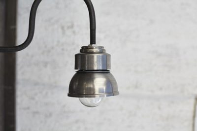 Wszystkie elementy metalowe z recyklingu. Stal surowa – może posiadać ślady rdzy i otarcia. Oprawka na żarówkę jest ebonitowa. Do takiej oprawki można wkręcić żarówkę – do 60W. Oprawka na duży gwint E27. Żarówka nie jest w cenie.