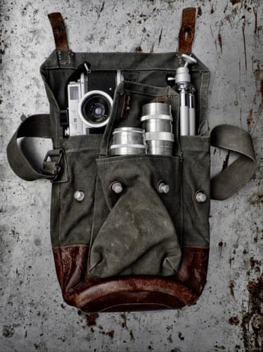 Ostatnie zdjęcie przedstawia taką torbę z aparatem fotograficznym Zorki 4.